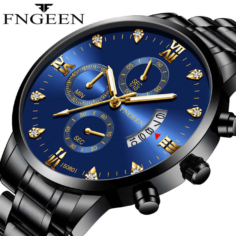 Freeship- Đồng hồ nam FNGEEN F5080 đồng hồ thạch anh mặt số đính đá lịch ngày chống thấm nước dây thép không gỉ cao cấp mua tại đây